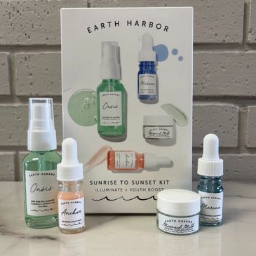 SUNRISE TO SUNSET Kit provides powerful skin revitalization with the youth boosting ritual of Oasis Deep Pore Gel Cleanser, Anchor Bio-Retinol Vitality Serum, Marina Biome Brightening Ampoule, and Mermaid Milk Nutrient Glow Moisturizer.